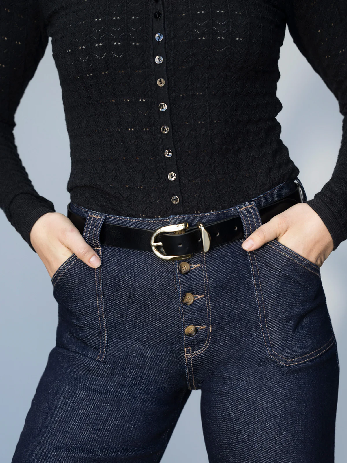 - The All Day Belt Black by Sanctuary Clothing features black leather and a shiny gold rounded buckle.